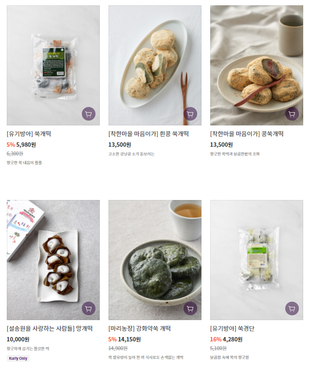 위에 있는 이미지가 마켓컬리에서 판매하고 있는 쑥개떡들이에요.